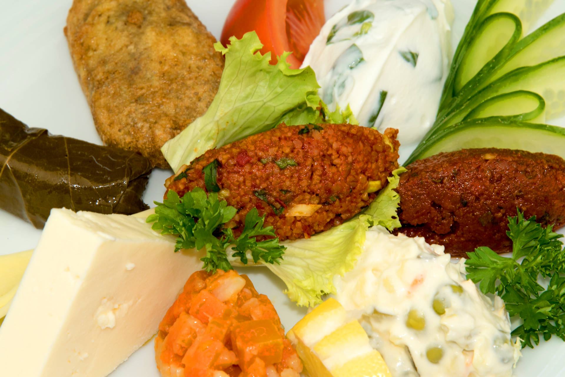 (patlıcan kızartma iyice yoğurdun altına gizlenmeye çalışır. Rus salatasının korkudan bezelyeleri fırlamış gibidir. Salam Rus salatasına sokulur, biraz buruşmuş, rengi yeşile dönmeye başlamıştır)